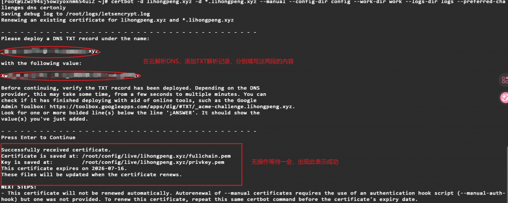 certbot -d lihongpeng.xyz -d *.lihongpeng.xyz –manual –config-dir config –work-dir work –logs-dir logs –preferred-challenges dns certonly